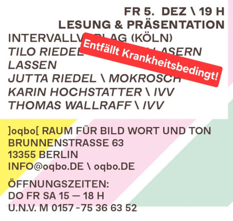 Im Programm des Ausstellungsformats 6 AUS 245 liest der Bild- und Wortkünstler Tilo Riedel aus masern lasern lassen (Lyrik/Wurfsendung) – die Autorin Jutta Riedel aus Mokrosch (Erzählung). Moderation: Karin Hochstatter und Thomas Wallraff, INTERVALLVERLAG (IVV).